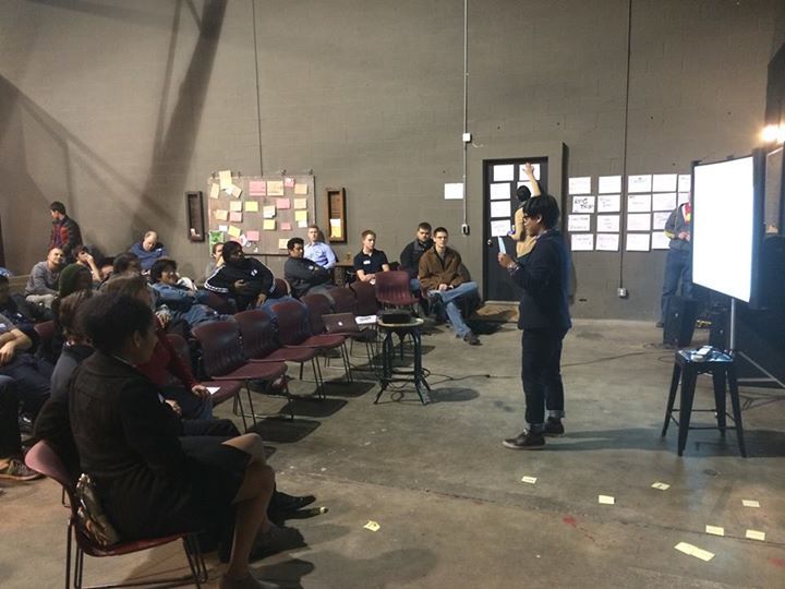 週五晚上是一個晚餐聚會,報到之後會拿到一張貼紙,你得自己寫名字自己貼在胸口,讓別人看到你知道怎麼叫你。大部份人都是站在食物旁邊聊天,這大概是我來美國目前看到最多 Pizza 的一次。晚餐過後有個簡單的暖場,主辦單位介紹了一下四位工作人員,以及這幾天的流程。第一個活動是先讓大家知道如何提案(Pitch),這邊的提案不需要很正式,只是一個 60 秒的快速介紹。主持人要大家瘋狂丟單字出來,然後寫在便利貼上往地上丟。這是一個暖場活動,在滿地的便利貼後,找了幾位志願者上台,隨機在地上撿兩張便利貼後,用電視購物的方式向大家推銷商品。
