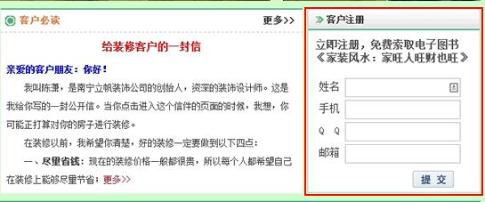 这个网站是广西南宁一个做家装的公司的官方网站。公司的负责人对我说,他们南宁地区做家装的人,都非常信风水,大凡做家装都要讲讲风水。所以,我就给这个客户出了个主意,我叫他在网络上搜集几篇、十几篇文章,然后在 WORD 上做好编辑排版,转化成 PDF 文件,这样就制作成了一个电子图书。这样一来,很多访问这个网站的意向客户,肯定就会对那本电子图书《家装风水:家旺人旺财也旺》感兴趣,反正是免费索取,不要白不要。这样一来,是不是就会吸引很多访客来注册,留下了他们的联系方式呢?当留下了他们的联系方式以后,公司业务就可以马上加他们的 Q,然后把电子图书发送给他。这样,一来二去,双方是不是就沟通上了?客户又看了电子图书,又与业务员进行了详细沟通,是不是就有成交的可能?你再想想,其他的家装公司有提供这种电子图书吗?我跟你说,基本没有。所以,这也是一个服务,这个服务会在客户的心里投下暗示:欸,这个公司服务还不错哦。这样印象是不是很好?这样成交的几率是不是大增了?