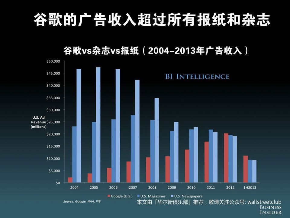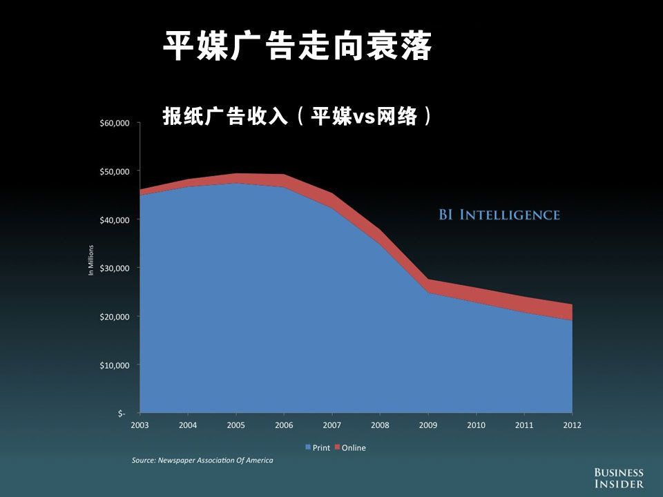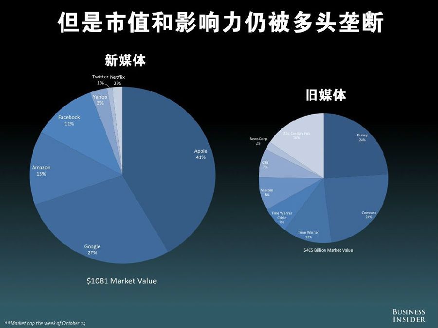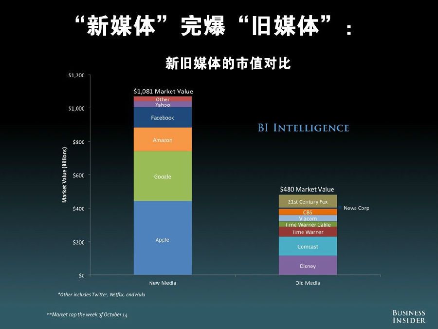 从市值上来看,以苹果、谷歌、亚马逊、Facebook、雅虎等为首的新媒体公司市值已超过 1 万亿美元,而以迪斯尼、Comcast、时代华纳、Viacom、CBS、新闻集团、21 世纪福克斯等为首的旧媒体,市值仅为 4800 亿美元,尚不足前者一半。