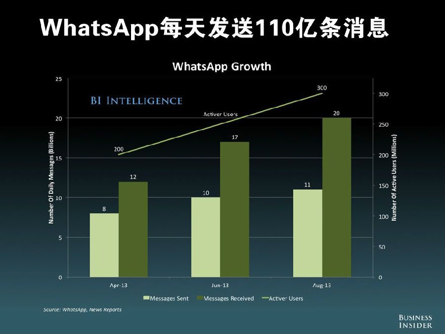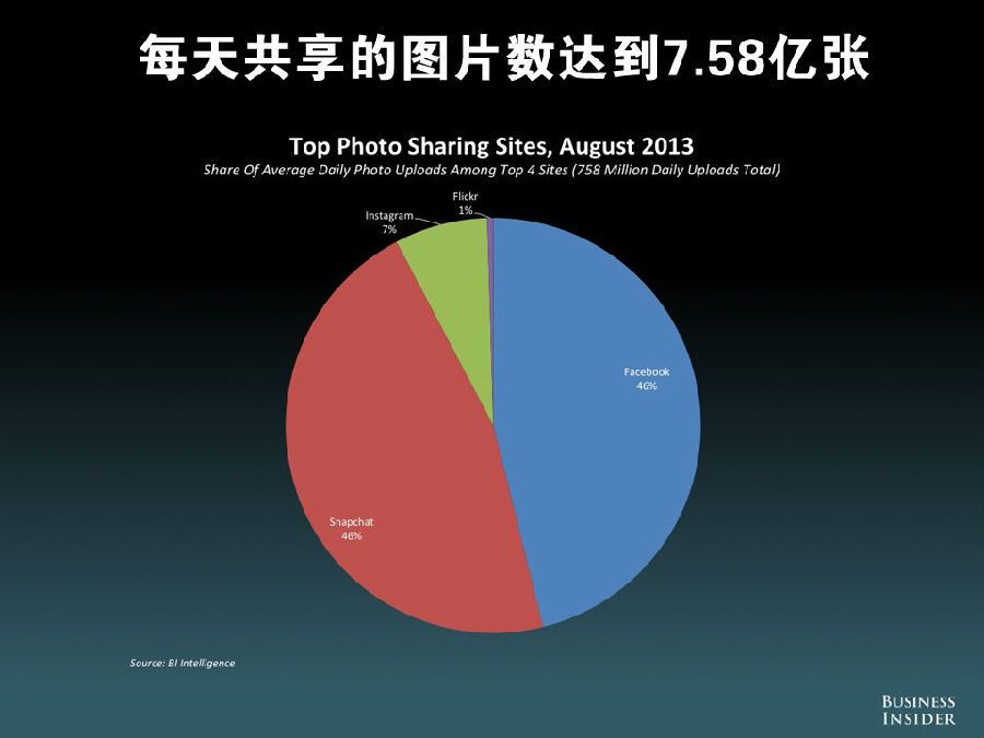 WhatsApp 每天发送的信息量高达 110 亿条,每天共享的图片数达到 7.58 亿张,其中 Snapchat 和 Facebook 平分秋色,均占 46%。