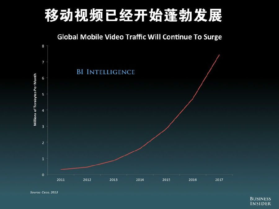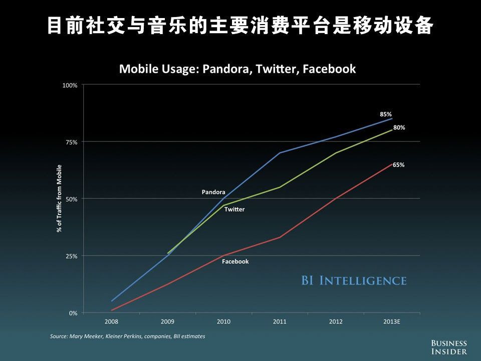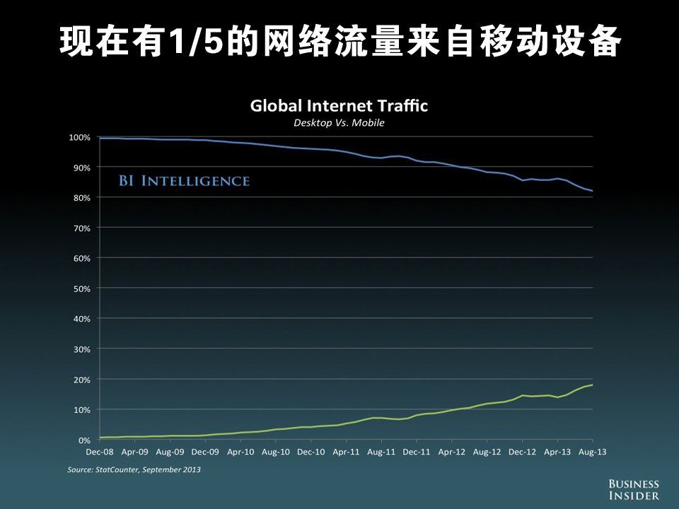 现在有五分之一的网络流量来自移动设备,移动视频已经开始蓬勃发展,目前社交与音乐的主要消费平台是移动设备,大约 3800 万 Facebook 美国用户只通过移动设备访问 Facebook。