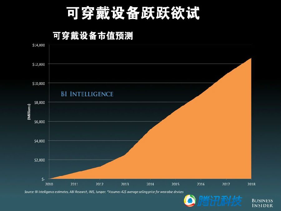 可穿戴设备市场,预计今年产业市值将突破 20 亿美元,明年将突破 40 亿美元,后年突破 60 亿美元,2018 年则会突破 120 亿美元。