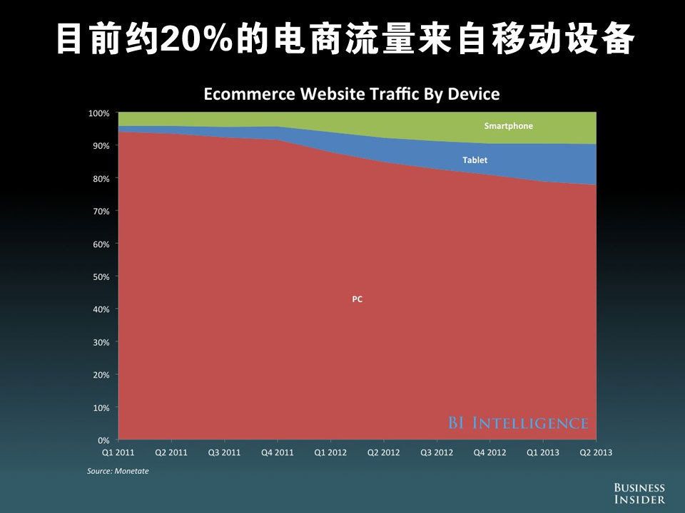 目前大约 20% 的电子商务流量来自移动设备,大约 11% 的电子商务营业额来自移动设备。