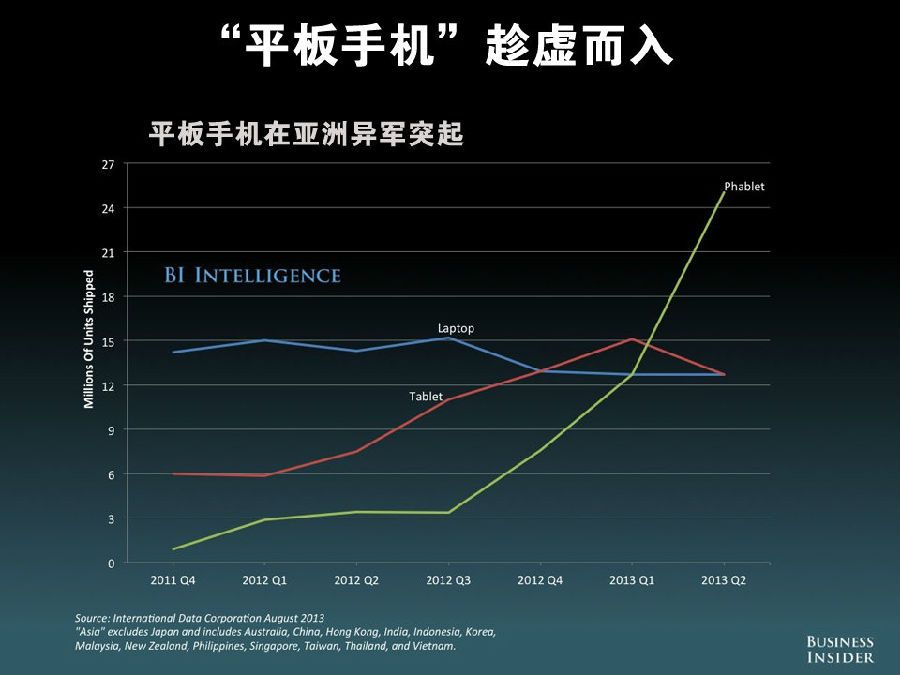 平板手机在亚洲异军突起,其出货量已经超过笔记本和平板电脑,今年第二季度达到约 2500 万台,笔记本和平板电脑出货量相当,约 1250 万台。