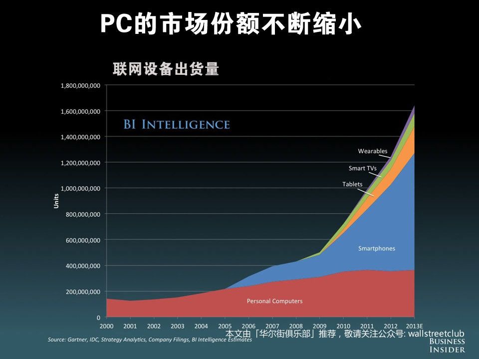 联网设备出货量方面,PC 市场所占份额不断缩小,越来越多被智能手机、平板电脑、可穿戴设备、智能电视蚕食,现在全球大约 60% 的联网设备是智能手机或平板。