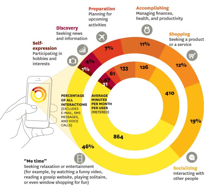 在智能手机的使用时间占比中,“个人时间”(Me Time)份额最大,达到了 46%。所谓个人时间,是指纯粹用于个人兴奋的行为,比如看一个搞笑视频,浏览八卦网站等等。