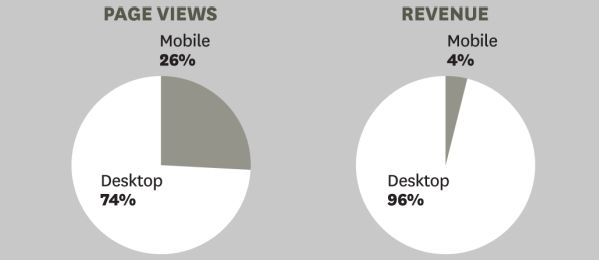 而以美国在线为例,移动终端贡献的流量在总流量中占到了 26%,但是却只带来总广告收入的 4%。