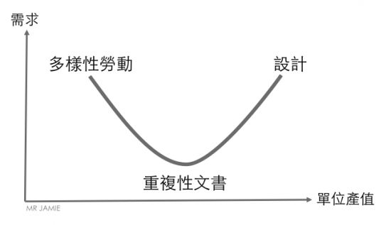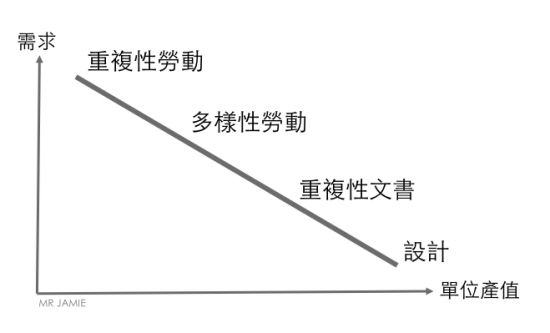 位於最左上的,是需求量最大,但單位產值 (通常會反應在時薪) 最低的重複性勞動,例如:生產線上的作業員、零售店員等等。緊接著是單位產值稍高,需求量稍低的多樣性勞動,例如:工頭、工廠領班、倉儲揀貨員等等工作。接著是辦公室裡面的基層,需求再更少的文書作業人員,例如:業務助理、總機、行銷專員、零售結帳人員等等。最後是需求最少,但單位產值最高,位於最右下方的各種「設計」人員,例如:產品設計、程式設計、創意總監、行銷總監、業務總監等等。(原來「勞動」的相對應該是「腦力」,但這些高階白領事實上並不是不動手的,他們必須把想法化諸為商品、軟體、文件、計畫、活動等「實物」,因此我決定把這樣的活動稱為「設計」。)