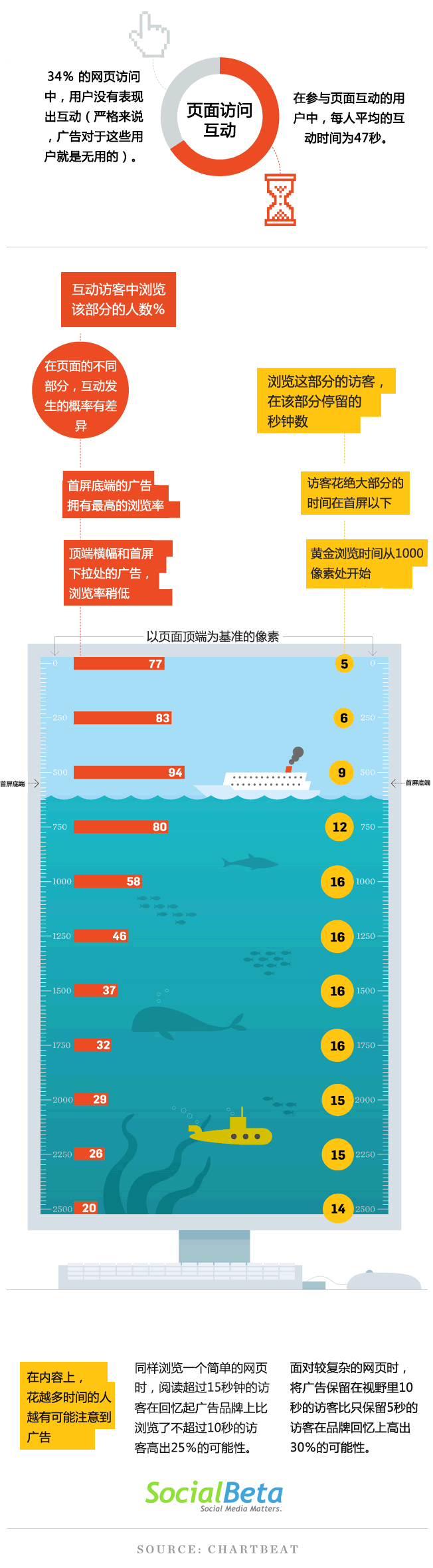 一张图告诉你网页的哪个部分浏览率最高 近来,不少人开始关注很多网络广告被无视的这一状况,以及由此而来的网页上最具价值部分的猜想。网络数据分析公司 Chartbeat 在分析了网络上 2500 万个用户访问数据之后,得到了些有趣的发现。和很多广告主的想法相反,吸引注意力最多的并不是页面的顶部; 而是首屏的底端。但若以用户在页面上各部分所停留的时间来衡量 (假设该部分周围的广告是受到关注了的),最有价值的部分则更要往下。