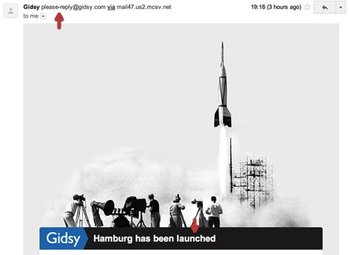 同样是一幅与其站点风格相一致的复古照片。另外,注意到他们用来发送邮件的邮箱名称没?与常见的做法不同,Gidsy 在这里使用了 "please-reply",以此向用户表达自己乐于倾听意见的姿态。