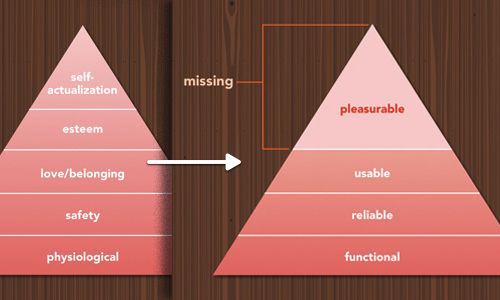“情感化设计 (Emotional Design)”一词由 Donald Norman 在其 同名著作 当中提出。而在 Designing for Emotion 一书中,作者 Aarron Walter 将情感化设计与马斯洛的人类需求层次理论联系了起来。正如人类的生理、安全、爱与归属、自尊和自我实现这五个层次的需求,产品特质也可以被划分为功能性、可依赖性、可用性和愉悦性这四个从低到高的层面,而情感化设计则处于其中最上层的“愉悦性”层面当中。