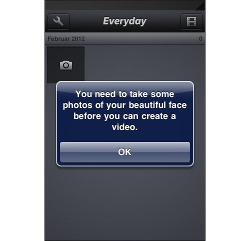 在 "Everyday" 应用当中,如果你还没有向媒体库中添加照片,那么系统就会非常友好的提示你去给自己“漂亮的脸蛋”拍些照片放到库中——简单的词汇定义了提示信息甚至是产品的基调,换句话说,就是个性。