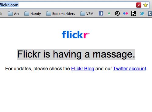用户在 Flickr 进行系统维护或升级期间会看到 "Flickr 正在做按摩 " 的提示,如果有兴趣的话还可以到他们的官方博客或是微博当中查看当前的具体状况。这样的文案比起简单粗暴的出错提示来说更能让用户接受。