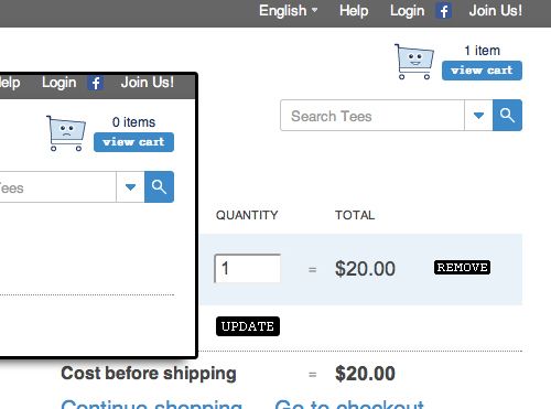 Threadless 的购物车在没有商品放入时会呈现出忧伤的表情,反之则会表现的非常开心。这样的小细节会让你觉得平凡而有趣,甚至会不由自主的笑起来。即使用户最终没有产生购物行为,他们也会记住这个可爱的购物车。