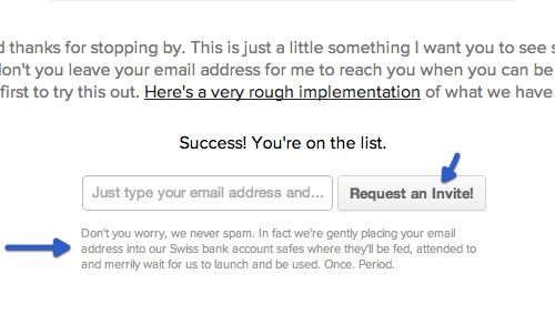 下面的范例来自我的一个个人项目,用户需要邀请码才可以试用这个产品。在提交申请的地方,我使用“我要获取邀请!”来代替传统的“提交”作为按钮当中的文案,希望这可以调动起用户的情绪,并使他们感受到一种更加真实、更加有针对性的互动。另外我也起草了一份简单的说明文案,让用户放心,我们绝不会发送垃圾邮件。
