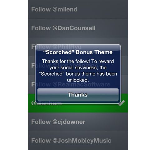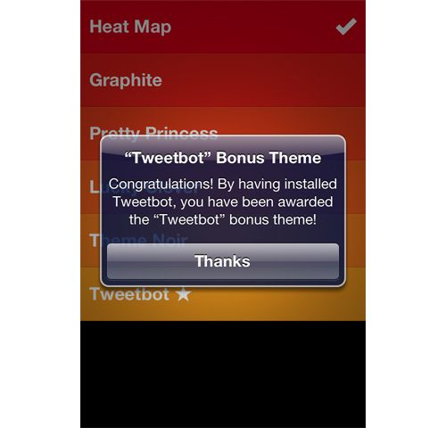 惊喜、专享:在应用中打开主题设置界面后,安装了 Tweetbod 的用户会收到一条消息,恭喜他们获得了专享的额外主题。这些用户很可能因为受到了特殊照顾而感到开心,另外,这个群体在口碑传播方面的作用是相当大的。