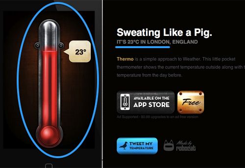 Thermo 应用的着陆页可以判断用户所处的地理位置,并在左侧以高度拟真的视觉表现形式来告诉用户当地的气温情况。