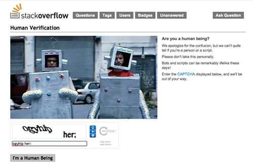 验证工具 Captcha 在如今被很多网站所使用,但这不意味着用户真的喜欢这东西,很多时候 Captcha 确实会令人感到烦恼和挫败。我们暂时无法改变这个工具本身的工作机制,但至少可以像 Stack Overflow 那样通过一幅有趣的图片搭配说明文案,向用户解释为什么要使用这个烦人的工具,籍此获得用户的理解,减少负面情绪的产生。