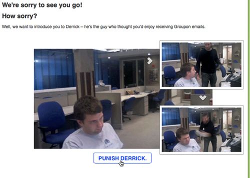 这方面最经典的案例莫过于 Groupon 的著名段子," 惩罚 Derrick"。虽然这个过场发生在用户确认退订之后,但它通过真实的人物以及锋利而又自嘲的幽默,切实拉近了用户与网站之间的距离。在这个多多少少会使退订用户产生内疚的段子之后,Groupon 还会再怂恿用户重新进行订阅。虽然你清楚的知道这是他们玩的小伎俩,但在如此具有代入感的段子面前,多数用户会觉得非常有趣,正面情绪和状态完全被调动起来。