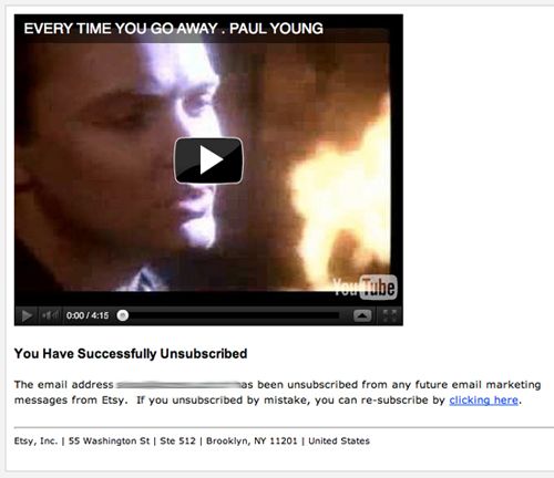 Etsy 会在用户退订之后播放 Paul Young 的 "Every Time You Go Away"。这种方式无法让用户留下来,但可以给他们留下深刻的印象。当用户再一次在 Etsy 平台上浏览商品时,多半会想起这个有意思的小环节,或许他们无论在哪里听到这首歌的时候还会想到 Etsy 呢。