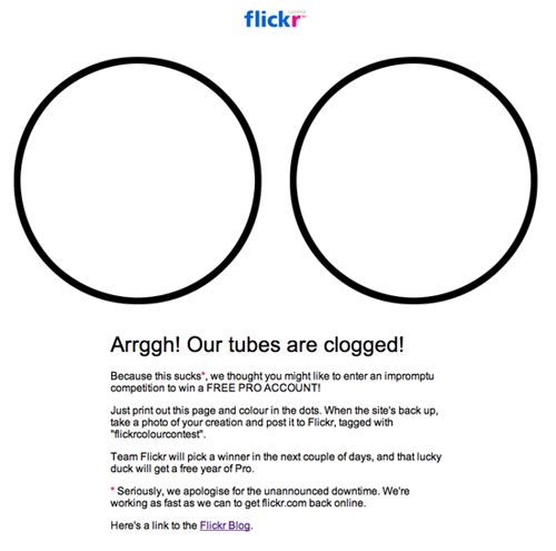 同样来自于 Flickr 的案例。当系统发生了一些更加严重的问题时,他们会告诉用户:“额,我们的管道堵塞了!”,然后使用非常口语化的文案表示了歉意。除此之外,他们还为用户设置了一个小任务,也就是将当前页面打印出来,为两个圆环填色,然后拍下来,等到站点恢复正常后传到 Flickr 上;Flickr 团队会挑选出优胜者,向他们赠送一年的高级帐号。