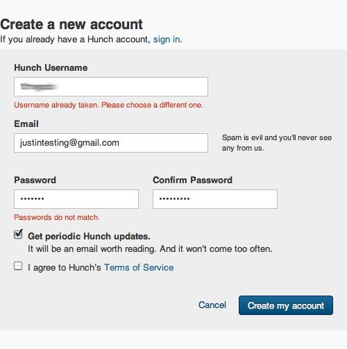 Hunch 注册页面当中的文案与我们通常能够见到的那种有所不同,他们会在输入邮件的文本框旁边告诉你“垃圾邮件是魔鬼,我们可不干这事”,还会在选择邮件订阅的地方提示你“这会是值得一读的邮件,而且来的不会太频繁”。在这些很普通的地方稍稍花些心思,制造一些细微的差异化,这会增强产品的代入感,使用户的注意力更集中,跟随设计的指引完成操作目标。