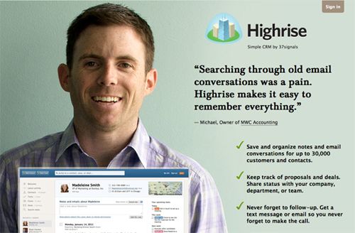 通过这张图片,Highrise 向我们展示了一个快乐的人,还有他使用该公司产品的故事。来自实际客户的微笑以及赞许之辞,这是非常正面的、非常容易促使潜在用户认同并期望获取其产品的宣传形式。