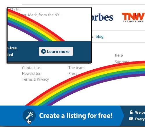 惊喜:浏览到页脚,你会发现鼓励你免费创建活动的图标与文案,当鼠标悬停在图标上的时候,一道绚丽的彩虹会突然冒出来,它的动画效果所指向的正是引导用户这个操作的按钮。
