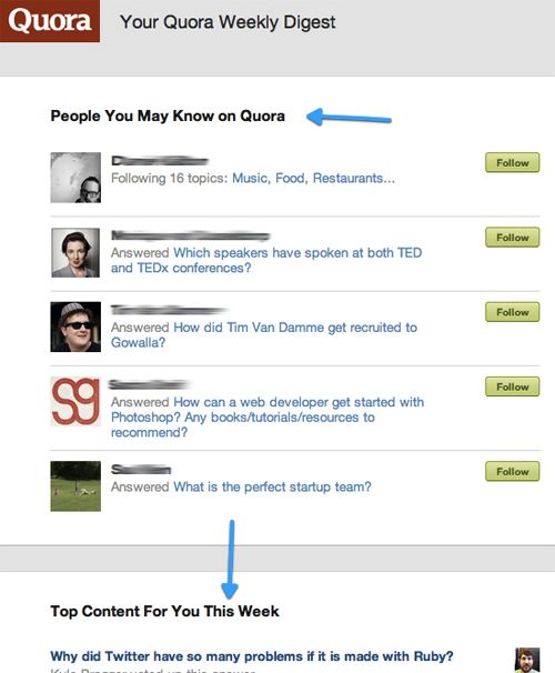 Quora 会在邮件当中向用户推荐他可能感兴趣的内容。如果你的网站或应用有足够的数据来支持这样的个性化服务,那么就考虑一下吧。