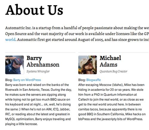幽默:在 Automattic 的“关于”页面中充满了和善幽默的自我介绍,感兴趣的用户在阅读时就能感受到他们那种充满乐趣的工作环境。
