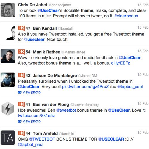 另外,如果你 follow 了 Clear 开发者的 Twitter 帐号,那么还能获取另外一款奖励主题。这个彩蛋的作用依然在于传播。人们会分享他们的热忱,甚至谈论他们获得或是错过了哪些主题。