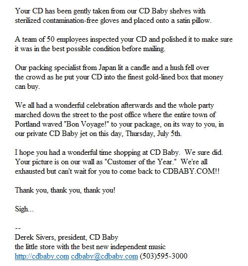 提醒类的邮件通常没有什么花头,只是起到告知的作用。如果能像 CD Baby 那样在其中添加一些特别的东西,用户的兴致就有可能被带动起来。这封邮件被发送出去之后,“CD Baby 私人喷气机”在 Google 当中产生了超过 2 万条记录。