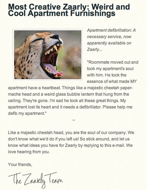 Zaarly 在他们的邮件快报中讲了一些具有神秘色彩的小故事,这种方式提升了邮件的吸引力,使用户不由自主的对其中的内容以及这个网站提供服务产生好奇,而不是一味的排斥。