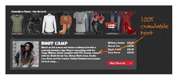 如果设计和 SEO 团队了解对方的要求,结果便会变得出色且具有创新性。以下图为例:这些是时装零售商的网站画面,左手边一栏由设计师勾画出,此面板的用户体验是成功的,它展示了一个穿着产品的模特,通过使用恰当的定位类型解释了到底用户通过单击可以期盼在这里看到什么。问题在于,从 SEO 角度来看,此面板无法收录。