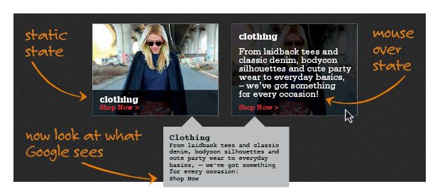 对这一问题的一个潜在的解决方案是鼠标悬停。最初查看时,面板将看起来同左手边一样(完全按照设计者的期望),然而当用户将鼠标滚动到图像上时,面板将变为右手边所看到的(正好是 SEO 所需要的)。