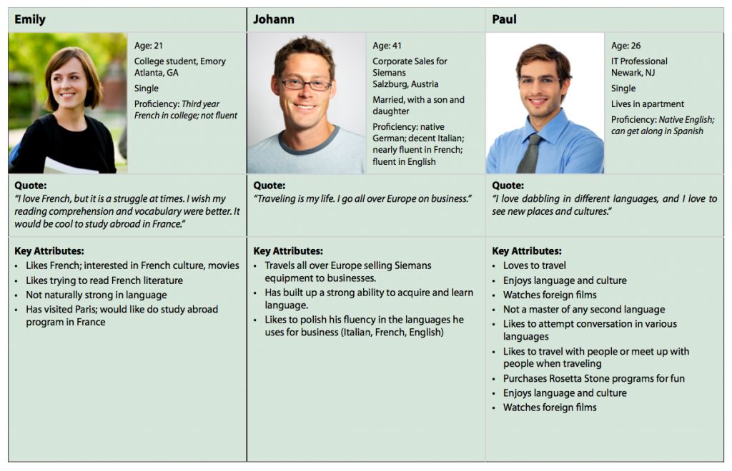 我们一共创建了 3 个用户角色,他们涵盖了目标用户群当中大部分的关键人格特征:Emily,学生;Johann,欧洲商旅人士 (后来的事实证明了我们的推测:应用销售额的 70% 都来自美国本土以外的用户);Paul,搞 IT 的,爱好学习新语言。