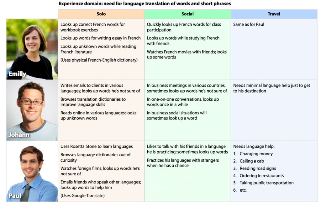 为了描绘出用户的现状,我们挑选出了与“翻译”相关的三个最关键的体验模式——个人翻译、社会化翻译和行程当中的翻译。