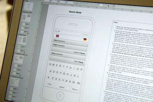 人们不喜欢做事,所以我们总是尽最大可能避免他们进行不必要的操作,或是被不相关的信息所干扰。上图当中的线框图展示了我们是怎样完成这个目标的。我们希望用户查找单词的过程尽量简短,所以在用户输入单词关键字时,与其他多数应用提供搜索建议的做法有所不同,我们会直接将对应这些搜索建议的单词翻译展示出来。我们还找到了一种解决语言切换问题的方法,也就是允许用户输入任何一种语言的单词,然后在界面左侧显示某种语言的翻译结果,在右侧显示另外一种语言的结果。
