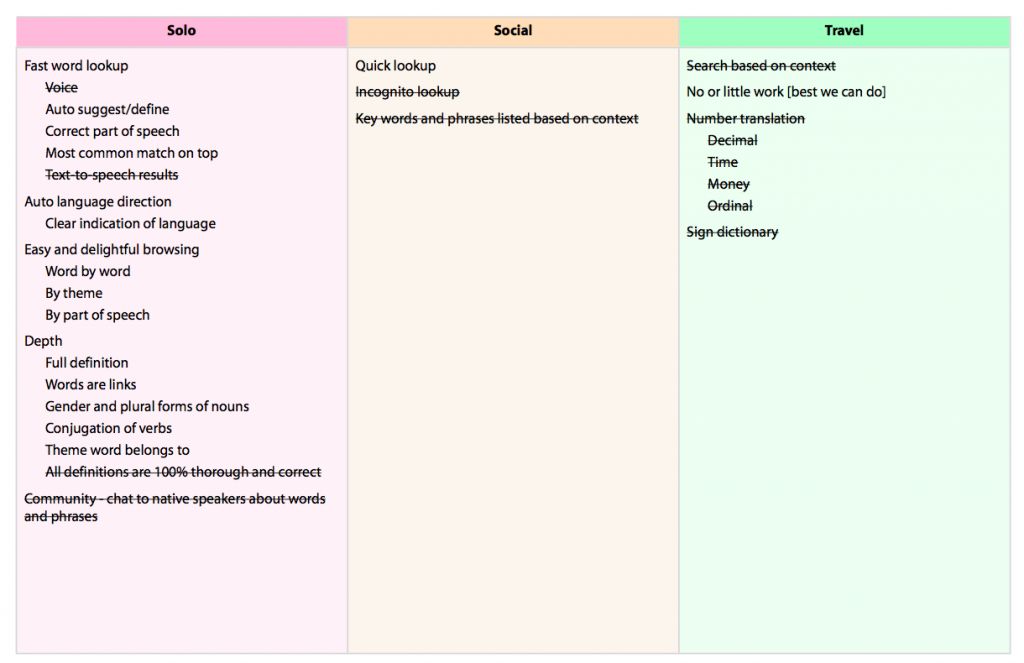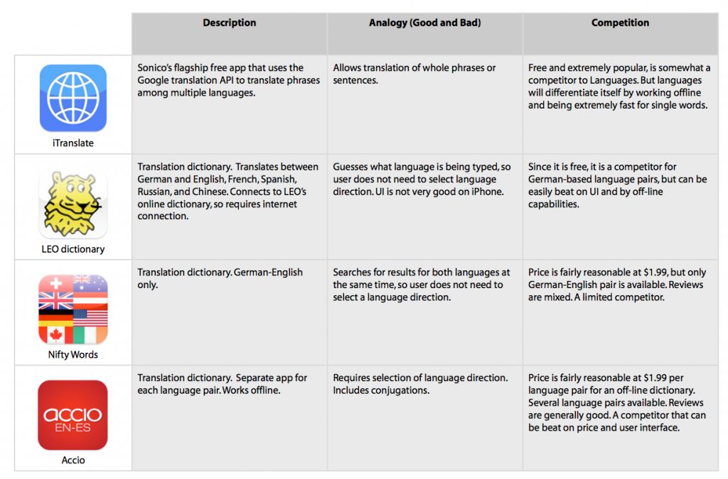 我们选取了一打最棒的竞品,分析它们的优势和不足,以及我们可以怎样击败它们。我们了解到,虽然市面上确实有一些离线翻译应用,但它们要么设计的很差劲,要么售价太贵。我们知道自己可以做的更好。