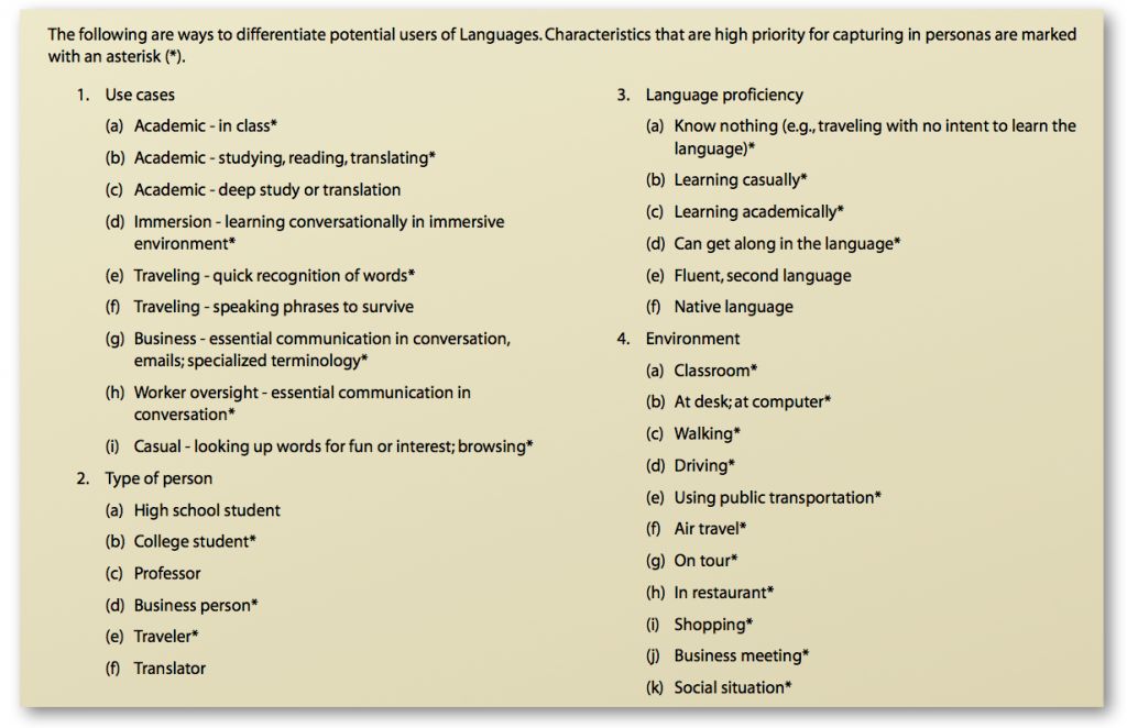 在我们的用户角色中,Emily 是一名 21 岁的大学生,在埃默里大学 (Emory University) 学习法语。她在语言方面没什么特殊的天分,但很喜欢法语,希望自己能试着读懂法文著作,而且盼望着到法国留学。