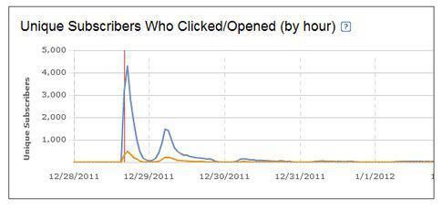 選擇在正確的日期和時間發送郵件是極為重要的,尤其是發送每日/週/月精選類郵件。下面是通常情況下一封郵件發送後的打開/點擊衰減曲線。