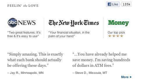 有時提供口碑信息可以促進對產品效果的認可,尤其是對於電商產品。Mint.com 在首頁上展示了名人認可和客戶口碑。我沒有關於這種方案有效性的數據,但你可以考慮向他們學習。口碑信息並不是總有用。比如 Facebook 就從不會標榜這個,但對於財務服務類產品而言,口碑就很可能是有用的。