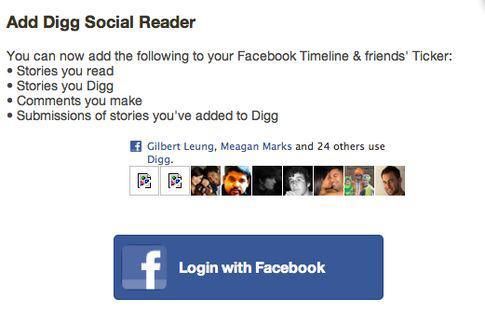Digg 在藉用社交網絡上做得很好,他們利用 Facebook 的 Open Graph 提示社交網絡上的讀者信息(使用 Facepile 插件)的同時,突出顯示了「使用 Facebook 賬號登錄」的註冊選項。Mixcloud 聲稱通過使用 Facepile 和 Facebook 賬號登錄,他們註冊的轉化率增長了 200%-300%(http://www.netmagazine.com/news/report-f8-london-part-2-111504)。儘管大多數的網站不會有同樣的提升效果,但根據我與其他開發者和設計師的交流來看,帶有 Facepile 的註冊按鈕能帶來 20%-50% 的註冊增長率。以下是 Digg 的做法: