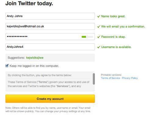 然後他們使用一個簡單的算法來推薦用戶名。用戶可以直接點擊選擇。假如你有一個類似 Melissa Anderson 這種爛大街的名字,你可能是第 53 個用這名字註冊 Twitter 的人,肯定不可能再用 anderson.melissa, melissa.anderson, melissa1…等姓名排列,因為這些早就被用過。Twitter 會在未被佔用的用戶名中給你推荐一個。這樣就能提高註冊率。