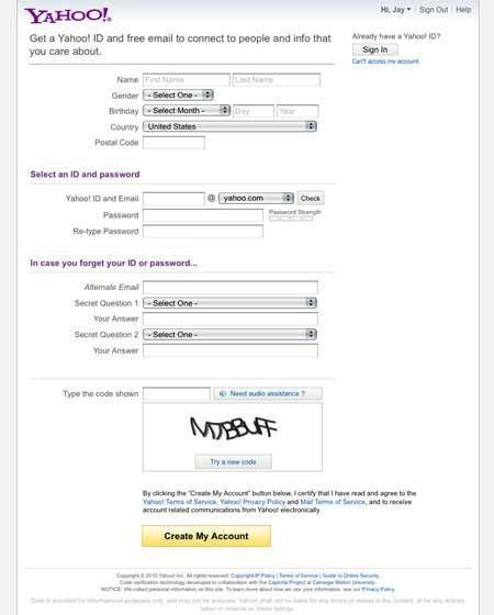 我覺得雅虎是專門產出可怕的註冊表並要求冗餘信息的傻 X 之一。看看這個申請郵箱賬號的註冊表單: