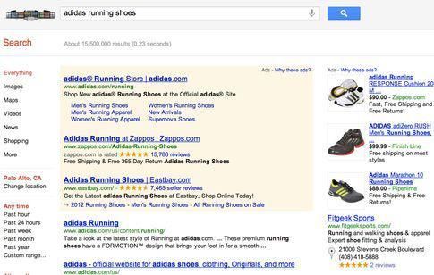 在元標題(meta title)和元描述(meta description)的頁面使用有針對性的關鍵字,因為大多數搜索引擎傾向於突出與用戶搜索查詢匹配的標題/描述關鍵詞。所以,如果我搜索「阿迪達斯跑鞋」,任何自然結果或推廣結果都會用加粗(譯註:中文搜索引擎會飄紅)顯示匹配關鍵字,如下圖所示。這些突出顯示的關鍵字很容易吸引眼球,增加用戶點擊你的搜索結果的機會,進而增加用戶進入你的網站的轉化率。在元數據中使用這些關鍵字,也提高了你的網站排名上升的機會,這本身就是轉化的優化。