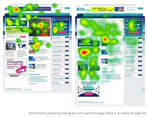 看看這個布里斯托爾機場網站的眼動熱點圖。這張圖表明,首屏只展現少量內容可以引導更多用戶往下瀏覽及點擊。