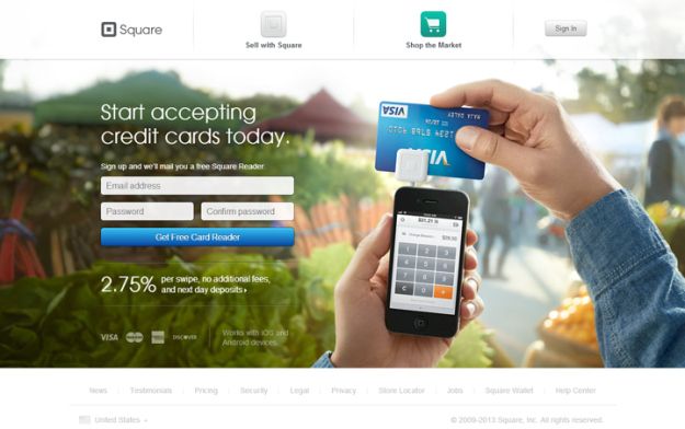 操作按鈕應該顯眼而不突兀。Square 在這方面做得很好。按鈕的顏色同全屏出血的背景圖及其他頁面元素形成了很好的對比。按鈕很大,但不會大得嚇人,並且按鈕旁邊搭配有很多呼喚用戶點擊的元素)。