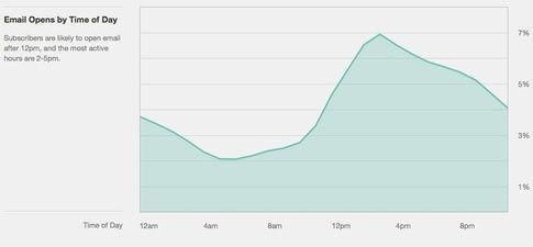 同時你要考慮發送郵件當天內的時間段。MailChimp 做了一項令人驚訝的研究,主題就是一天的郵件打開/點擊活動的最佳時間: