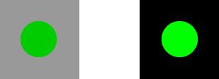 这两个绿色的圆圈完全一致,事实上右边的绿色圆圈是复制自左侧,当然他们的亮度也就完全一样,但是他们不同色彩的背景导致了我们对对对比度敏感的视觉系统认为右侧更亮一些。